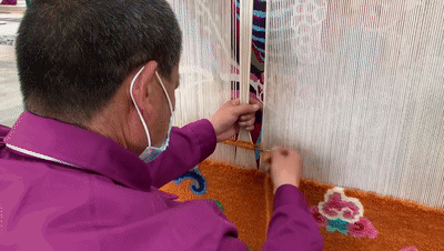 △这幅手工枪刺藏毯以长城为原型,面积接近14平方米。两人同时操作需两个月时间完成。(总台央视记者王鹏飞、杨松涛拍摄)