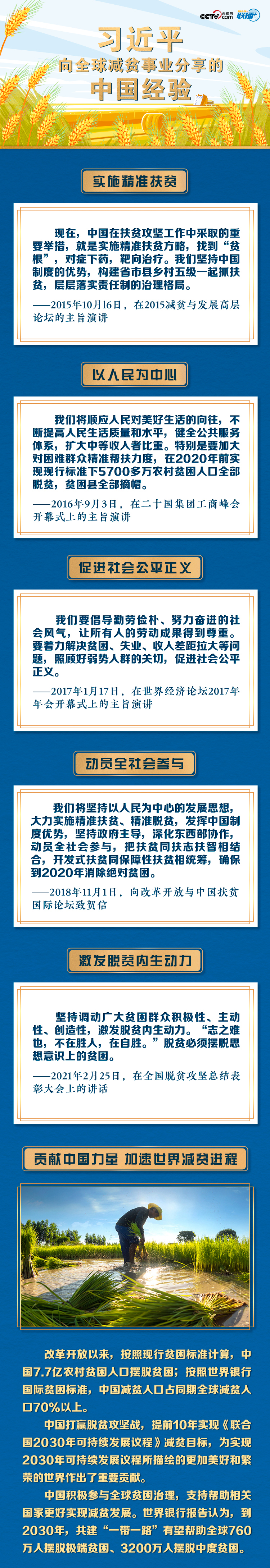 消除贫困,自古以来就是人类梦寐以求的理想,是各国人民追求幸福生活的基本权利。这些年来,习近平主席多次在重要活动中阐释中国理念、分享中国经验,推动全球减贫事业大踏步向前。中国在摆脱贫困方面取得的非凡成就为国际社会带来希望、提供激励,为推动构建人类命运共同体贡献了中国力量。