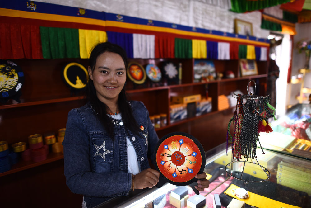 长江源村村民才旦卓玛在自家的工艺品店展示手工艺品。开展职业培训,鼓励村民进城务工,加上草原奖补等政策,让长江源村家家都有稳定可观的收入。2017年,长江源村正式脱贫摘帽。