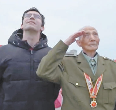 高佑思(左)与军医老爷爷在天安门广场一同观看升旗仪式。