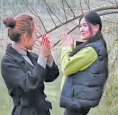 马觉娜(右)和村干部共同录制短视频。