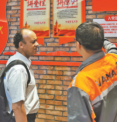 VAMA公司党员为乔治讲解“不忘初心、牢记使命”主题教育相关内容。 资料图片