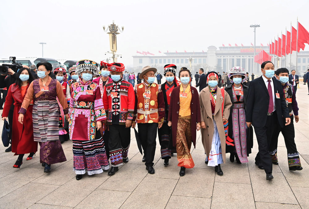 ↑2021年3月5日,十三届全国人大四次会议在北京开幕,全国人大代表走向会场。在十三届全国人大代表中,少数民族代表占代表总数的14%以上,全国55个少数民族都有本民族的代表。