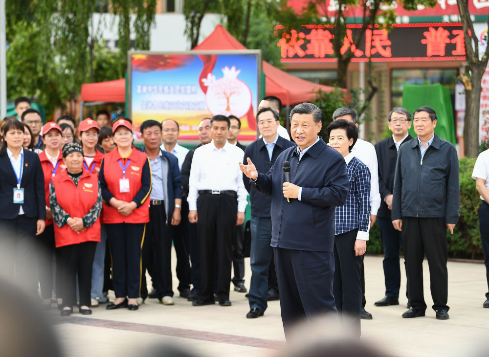 ↑2020年6月8日,习近平在宁夏吴忠市利通区金花园社区广场,同居民们亲切交流。