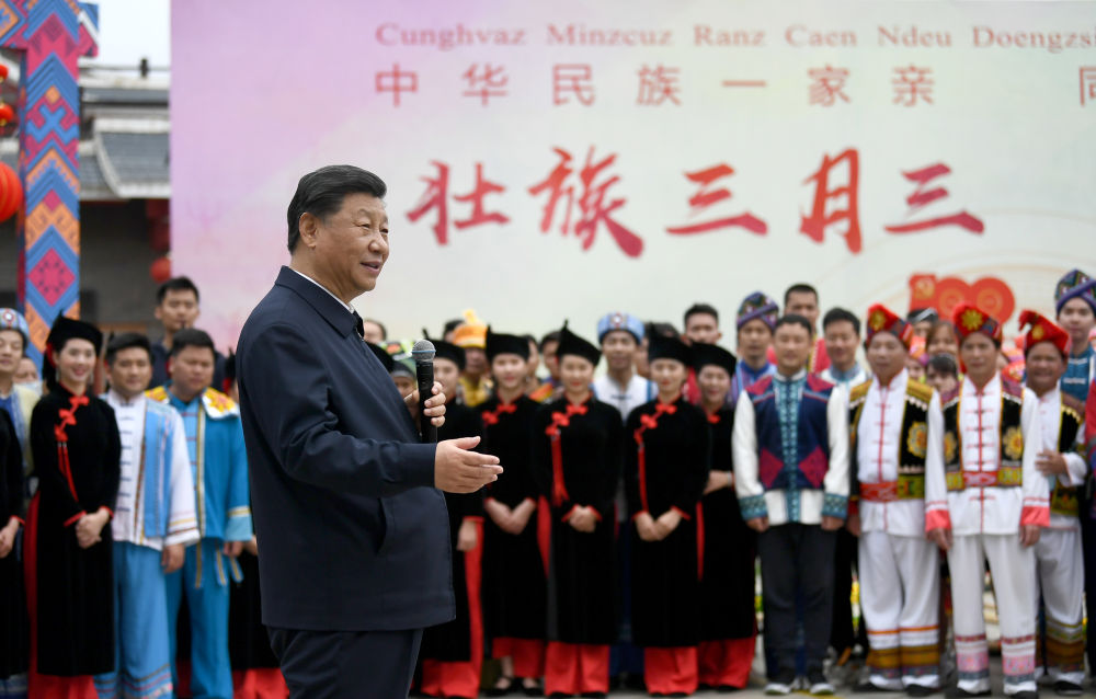 ↑2021年4月27日,习近平在南宁市广西民族博物馆外,同参加三月三“歌圩节”民族文化活动的各族群众亲切交流。