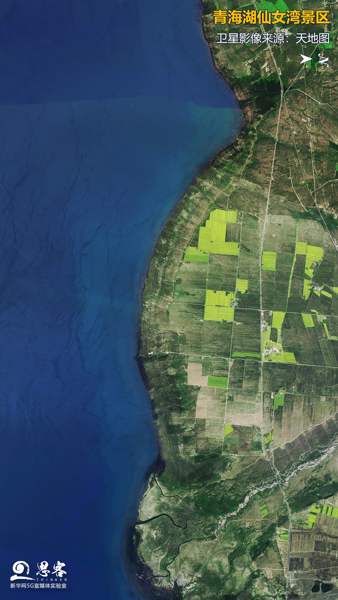 卫星视角下的青海湖仙女湾景区。卫星影像来源:天地图