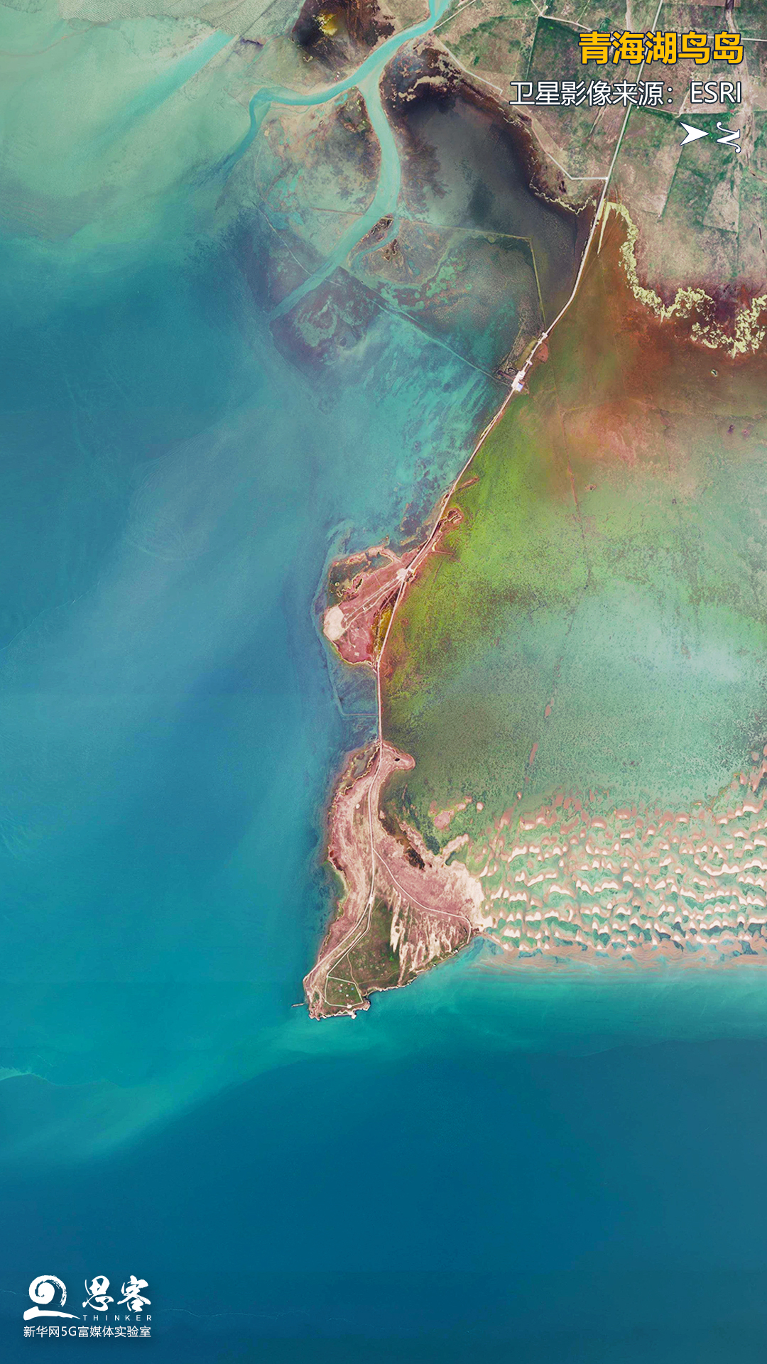 卫星视角下的青海湖鸟岛。卫星影像来源:ESRI