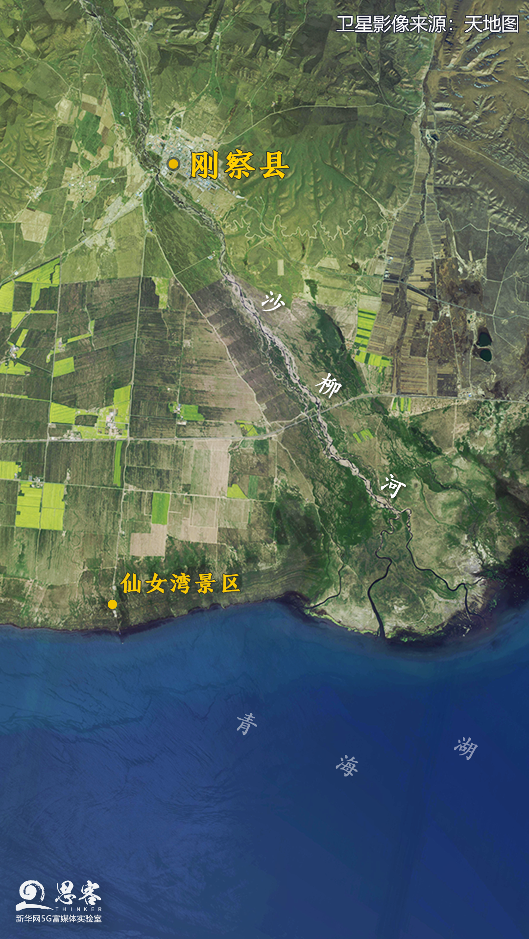 卫星视角下的刚察县及青海湖。卫星影像来源:天地图