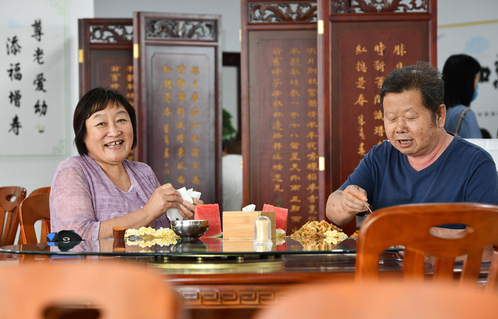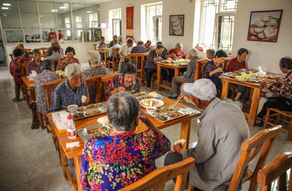 为破解居家养老吃饭难,山东省荣成市全面推进“暖心食堂”建设。这是2020年7月4日,老人们在荣成石岛管理区斥山街道盛家村“暖心食堂”内用餐。