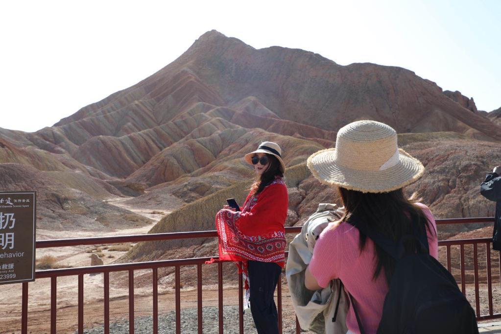 游客在张掖七彩丹霞景区拍照留念。新华社记者李杰摄