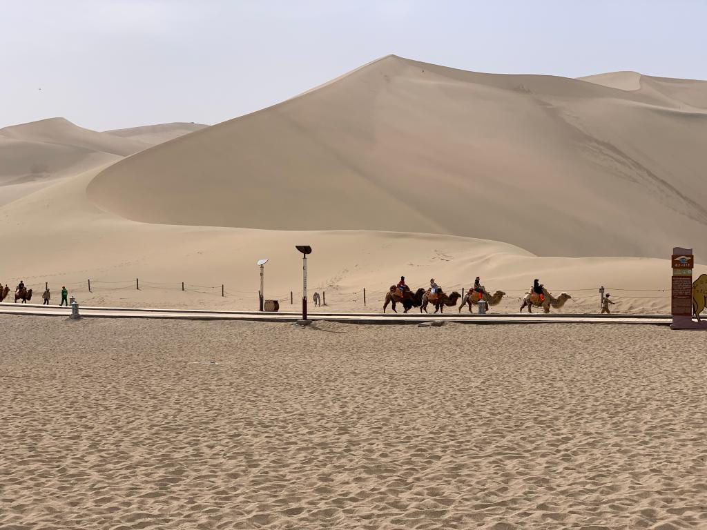 敦煌鸣沙山月牙泉景区内,游客骑着骆驼感受沙漠之美。新华社记者李杰摄