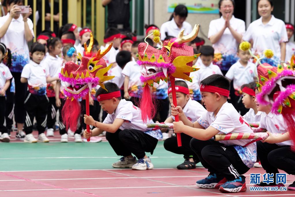 6月10日,在重庆市北碚区缙云幼儿园,孩子们参加旱地龙舟比赛。