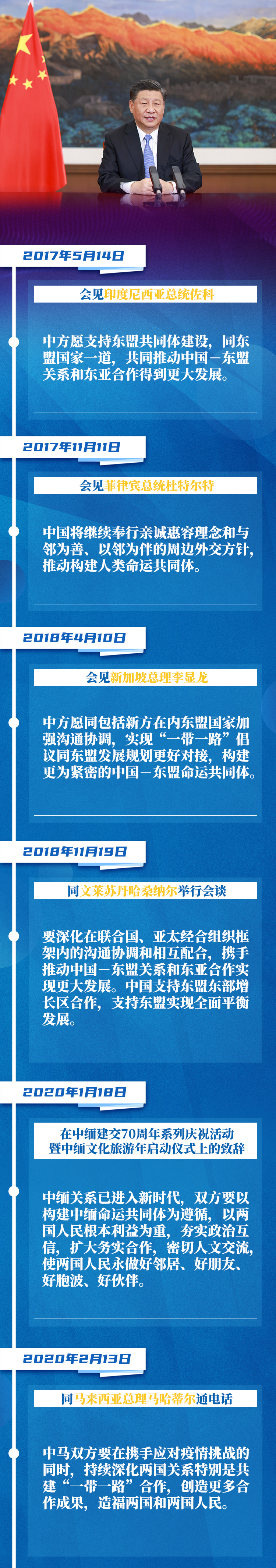 2020年11月27日,在第十七届中国-东盟博览会和中国-东盟商务与投资峰会开幕式上,习近平指出,中国-东盟关系成为亚太区域合作中最为成功和最具活力的典范,成为推动构建人类命运共同体的生动例证。