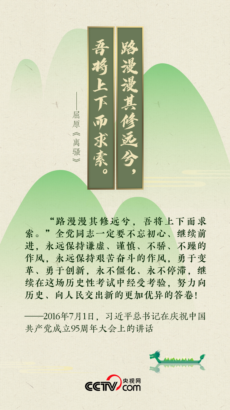 2016年7月,在庆祝中国共产党成立95周年大会上,习近平总书记娓娓道出屈原的名句“路漫漫其修远兮,吾将上下而求索”,号召全党同志不忘初心,勇于变革创新,继续前进。