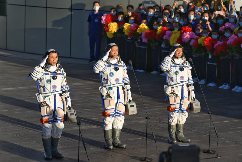 6月17日,神舟十二号载人飞行任务航天员乘组出征仪式在酒泉卫星发射中心举行。人民网记者 翁奇羽摄