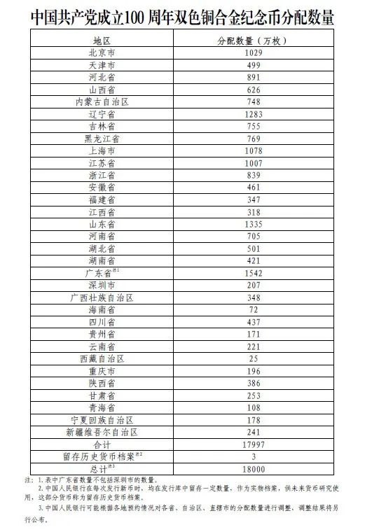 双色铜合金纪念币面额10元,直径27毫米,材质为双色铜合金,发行数量1.8亿枚(含留存历史货币档案3万枚),各省、自治区、直辖市双色铜合金纪念币分配数量如下: