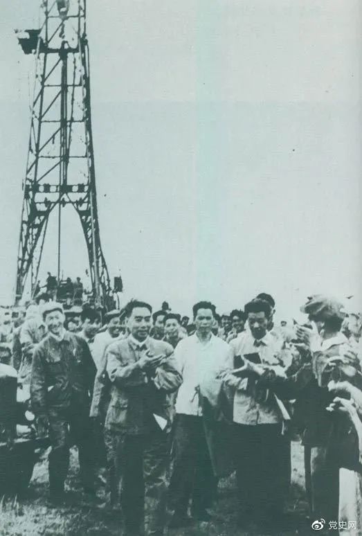 1962年6月,周恩来到大庆视察。这是在1202钻井队现场参观。