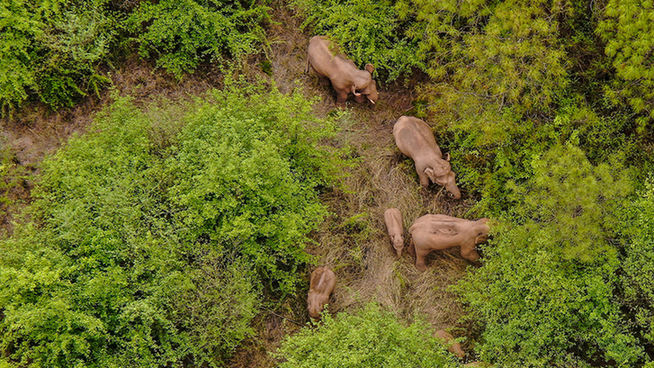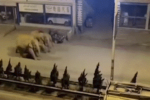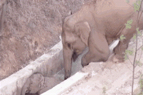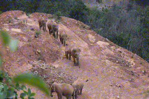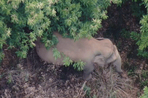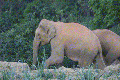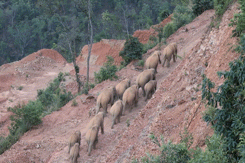 象群中有两头小象偷吃酒糟醉酒而掉队