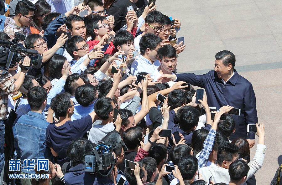 2018年5月2日,中共中央总书记、国家主席、中央军委主席习近平来到北京大学考察。这是习近平离开学校时同道路两旁师生亲切握手。新华社记者王晔摄