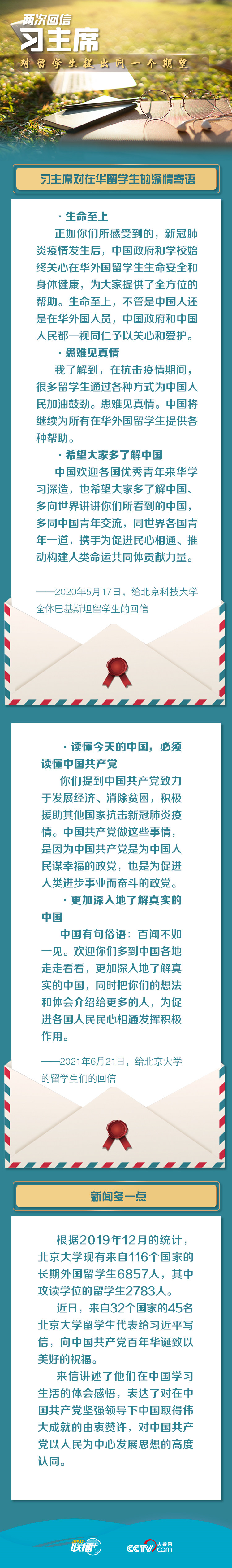 央视网《联播+》特梳理两次回信内容,带您重温习主席对在华留学生的深情寄语。