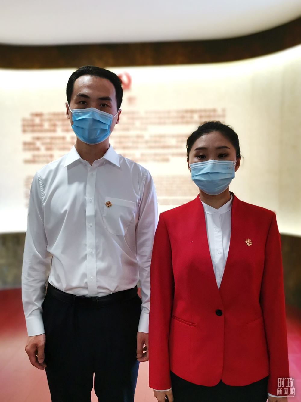 △“光辉伟业 红色序章——北大红楼与中国共产党早期北京革命活动主题展”讲解员朱宁、谢尹楠。(总台央视记者李晓周拍摄)
