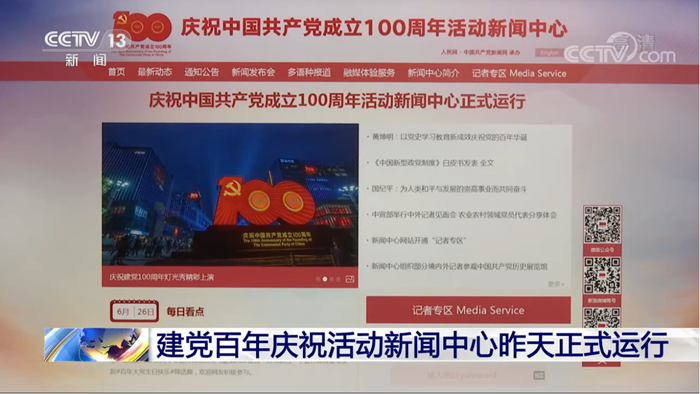 昨天(6月26日),设在北京梅地亚中心的庆祝中国共产党成立100周年活动新闻中心正式运行。