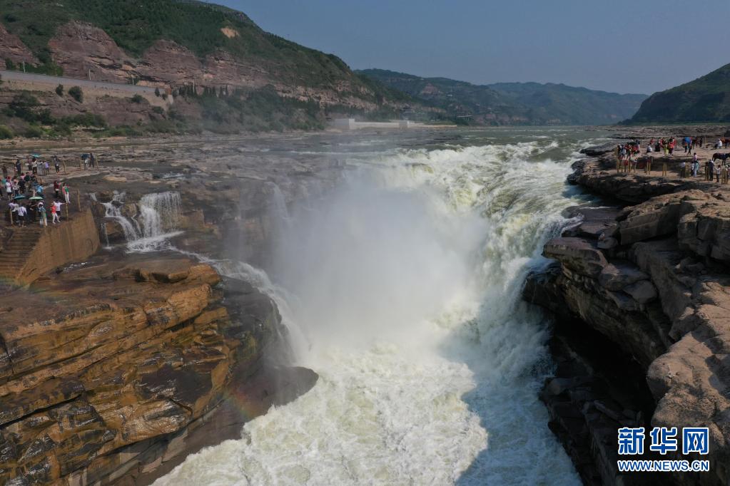 6月27日,游客在山西吉县黄河壶口瀑布景区游览(无人机照片)。