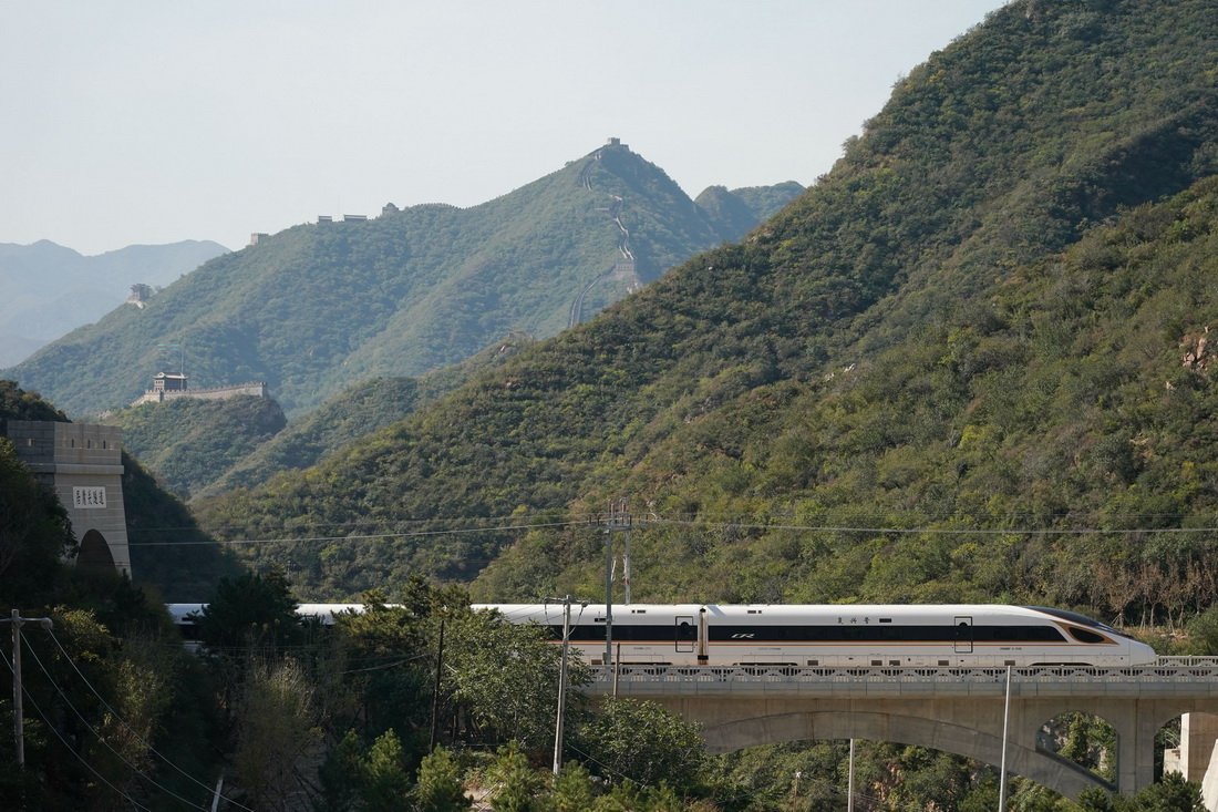 一列复兴号高铁列车从京张高铁驶过居庸关长城(2020年10月6日摄)。新华社记者 鞠焕宗 摄
