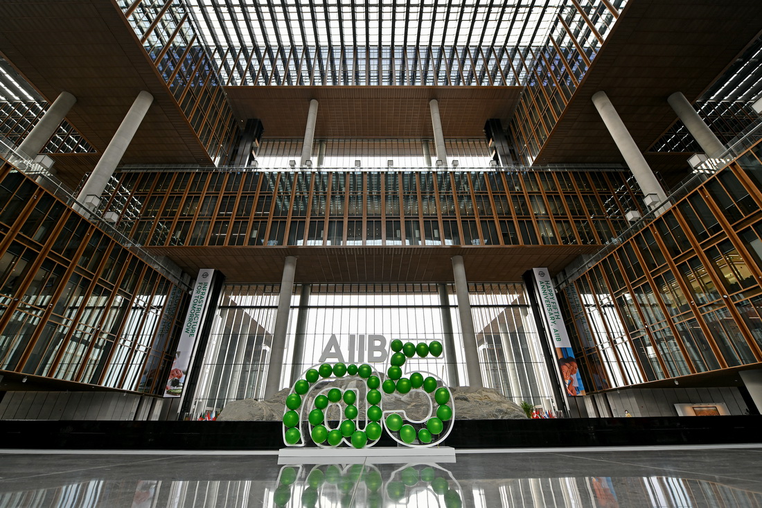 这是亚投行总部大楼内景和庆祝正式开业五周年装饰(2021年1月13日摄)。新华社记者 李鑫 摄