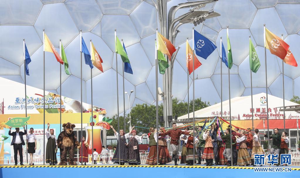 来自俄罗斯的演员在北京奥林匹克公园举行的亚洲文明巡游活动中表演(2019年5月16日摄)。新华社记者 殷刚 摄