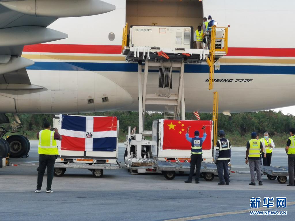 这是2021年3月17日,运载中国援助的新冠疫苗等物资的飞机抵达多米尼加首都圣多明各。新华社发(中国驻多米尼加大使馆供图)