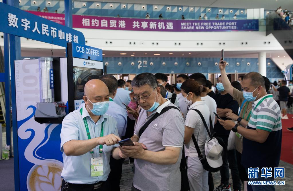 在海口举行的首届中国国际消费品博览会上,参观者体验数字人民币咖啡机(2021年5月10日摄)。新华社记者 金立旺 摄