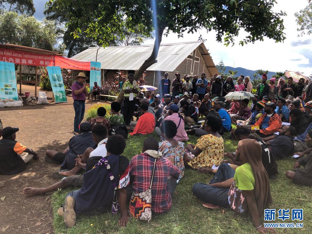 2020年12月15日,林应兴(戴草帽者)在巴布亚新几内亚东高地省中国援助巴新菌草和旱稻技术项目第9期培训班上授课。新华社发