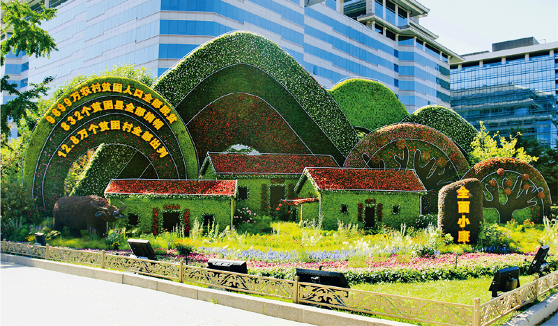 近日,在北京长安街沿线,10组献礼中国共产党成立100周年的立体花坛亮相,生动展示中国共产党的奋斗历程和伟大成就。图为“全面小康”主题花坛。 人民视觉 方淑媛/摄