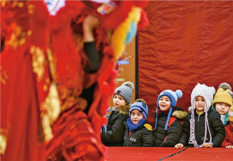 脱贫、全面小康、现代化,一个民族也不能少。图为小朋友在新疆乌鲁木齐大巴扎步行街观看元宵节舞狮表演。 新华社记者 王菲/摄