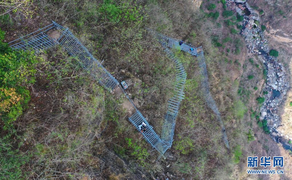 在四川省凉山彝族自治州昭觉县阿土列尔村的悬崖钢梯上,村民沿着钢梯下山(2020年5月13日摄,无人机照片)。新华社记者 王曦 摄