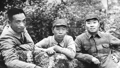 图为王诤(左)、刘寅(右)和1932年在鄂豫皖苏区抄收过红中社新闻的王子纲(资料照片)。新华社发