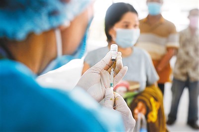 6月1日,一名医务人员在柬埔寨金边为民众接种中国研制的新冠疫苗。