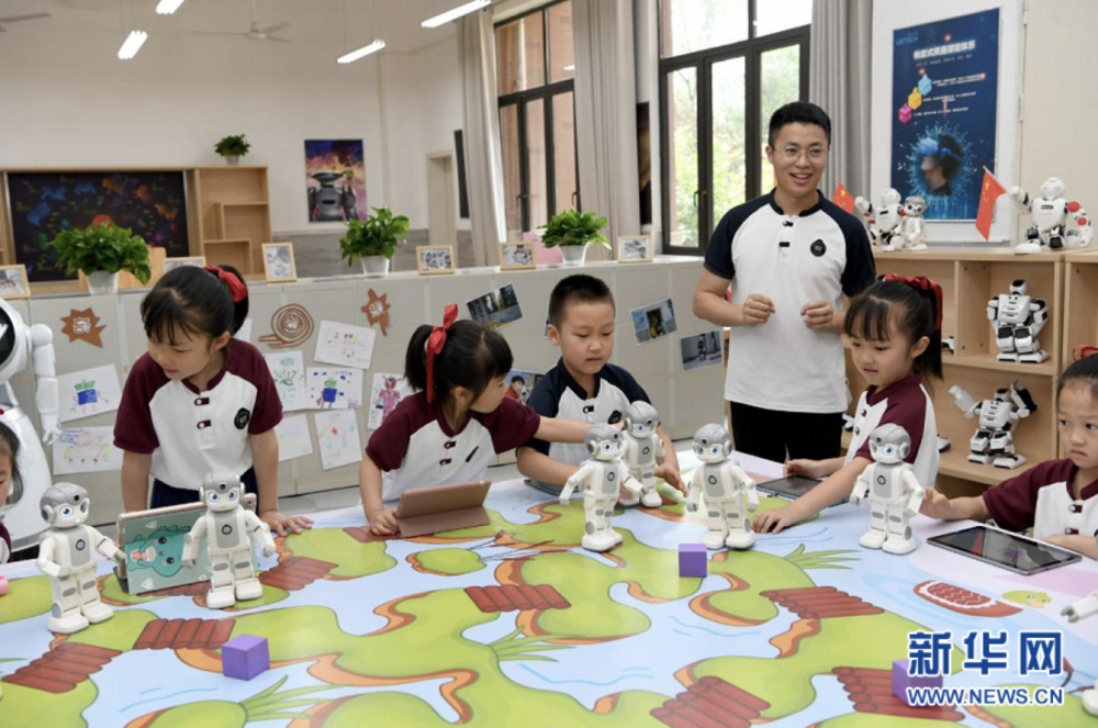 在重庆市两江新区行远小学,孩子们通过大屏幕,跟着老师一起学编程。新华网发
