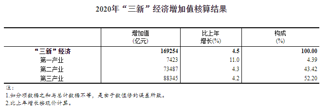 2020年,尽管受到突如其来的新冠肺炎疫情的巨大冲击和严峻复杂国际形势的影响,我国新产业新业态新商业模式仍继续保持增长。经核算,2020年我国“三新”经济增加值为169254亿元,比上年增长4.5%(未扣除价格因素,下同),比同期国内生产总值(GDP)现价增速高1.5个百分点;相当于GDP的比重为17.08%,比上年提高0.7个百分点。