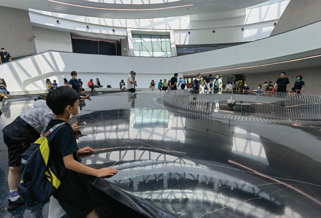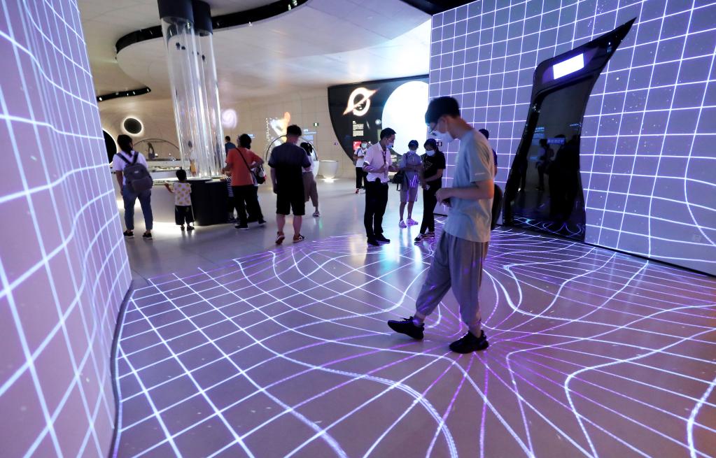 上海天文馆引入体感互动、数据可视化、增强现实(AR)、虚拟现实(VR)、生物识别等技术,精心设计环境氛围、灯光音效和高仿真场景模拟手段,构建沉浸式宇宙空间体验环境。值得一提的是,上海天文馆的300余件展品中,互动展品占比50%以上。