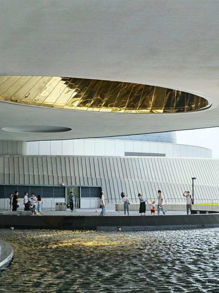 从空中俯瞰,整个天文馆像一座表现时间流逝的大型天文仪器。主建筑以优美的螺旋形态构成“天体运行轨道”,独具特色的圆洞天窗、球幕影院和倒转穹顶这三个圆形元素构成“三体”结构,共同诠释天体运行的基本规律。其中,圆洞天窗位于主建筑的入口,当太阳光穿过圆洞,会在地面形成光斑,随着太阳在天空中移动,光斑也将在地面上缓缓移动,起到像日晷一样的作用。
