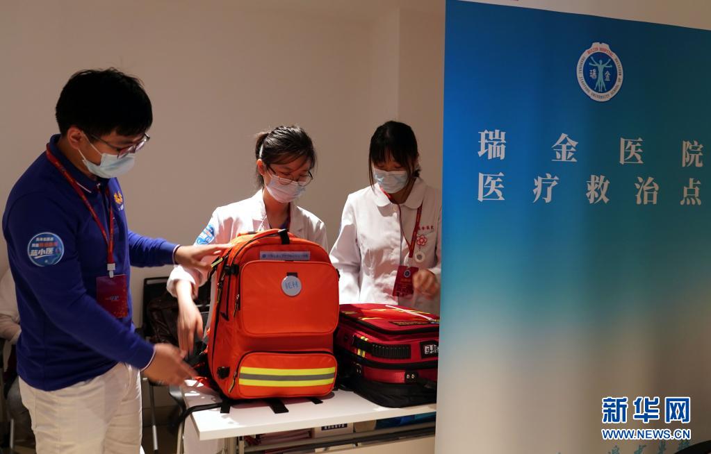 上海交通大学医学院附属瑞金医院的医护人员担当志愿者,在中共一大纪念馆设立医疗救治点,提供医疗保障任务(7月11日摄)。