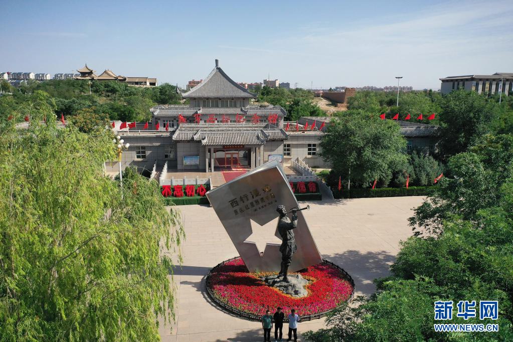 宁夏吴忠市同心县红军西征纪念馆前的小号手雕塑(无人机照片,6月22日摄)。新华社记者 王鹏 摄