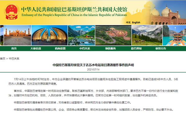 中国台湾网7月15日讯 中国驻巴基斯坦使馆14日就达苏水电站项目遭遇爆炸事件发表声明。声明说,7月14日上午当地时间7时左右,中方企业承建的开普省达苏水电站项目出勤班车在赴施工现场途中遭遇爆炸。目前已造成9名中方人员、3名巴方人员遇难。巴方正在对原因展开调查。