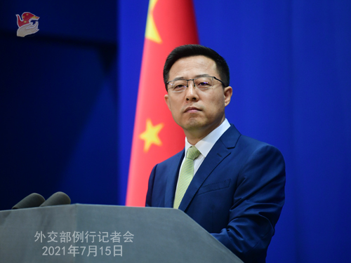 中国台湾网7月15日讯 据外交部网站,外交部发言人赵立坚7月15日主持例行记者会。