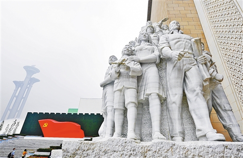 中国共产党历史展览馆广场上的雕塑庄严矗立。
