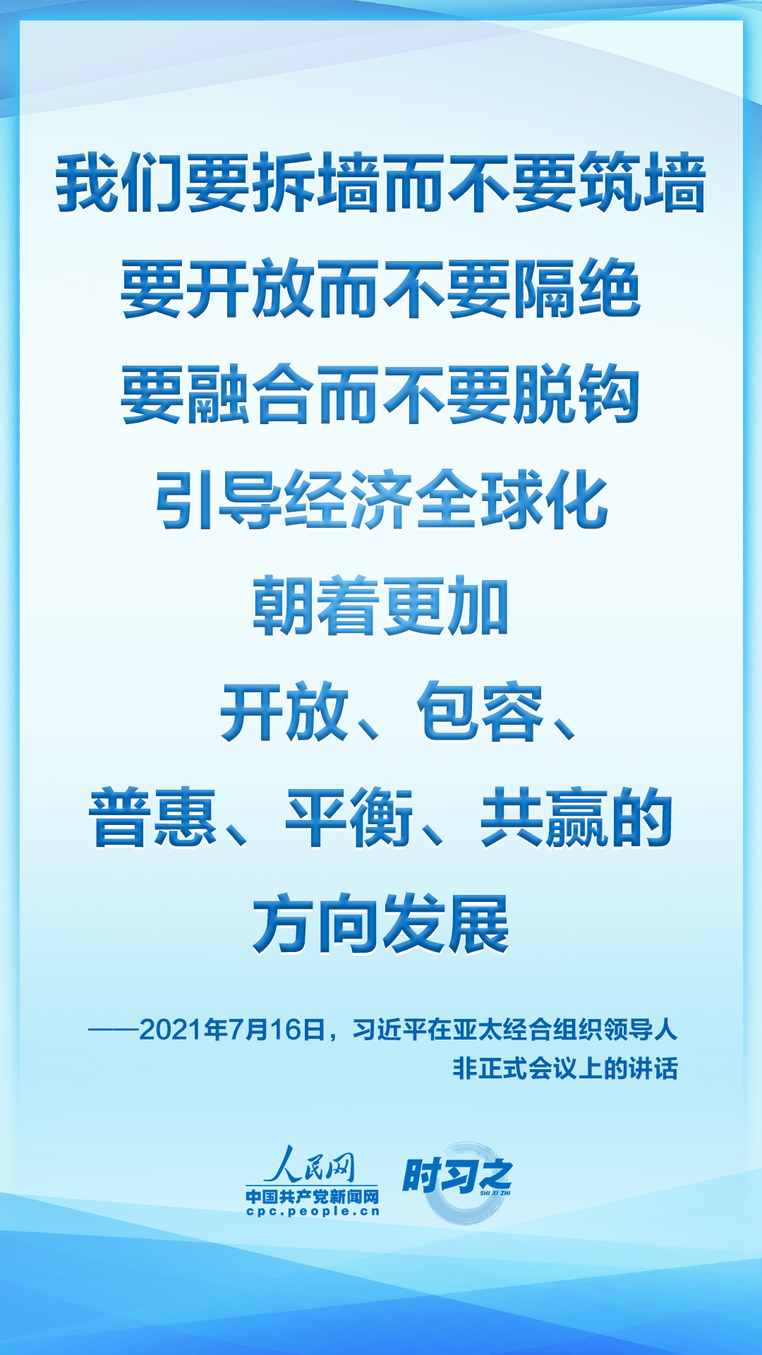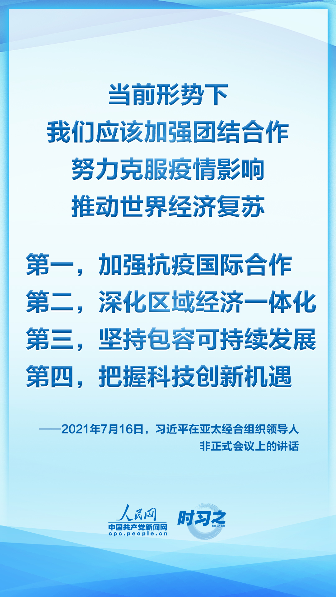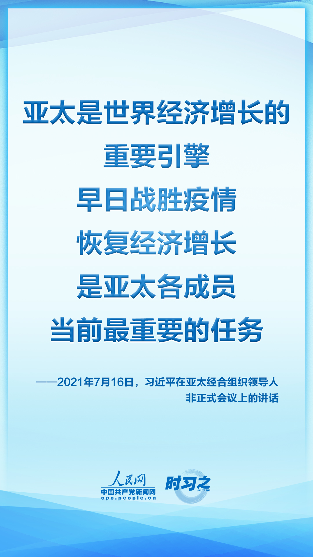 7月16日晚,国家主席习近平应邀在北京以视频方式出席亚太经合组织领导人非正式会议并发表讲话。他指出,当前,新冠肺炎疫情起伏反复,疫情防控形势依然严峻。同时,和平与发展仍然是时代主题,维护多边主义,加强团结合作,共同应对挑战的呼声更加强烈。我们去年通过了亚太经合组织2040年愿景,提出了亚太共同体目标。亚太是世界经济增长的重要引擎。早日战胜疫情,恢复经济增长,推动世界经济复苏,是亚太各成员当前最重要的任务。