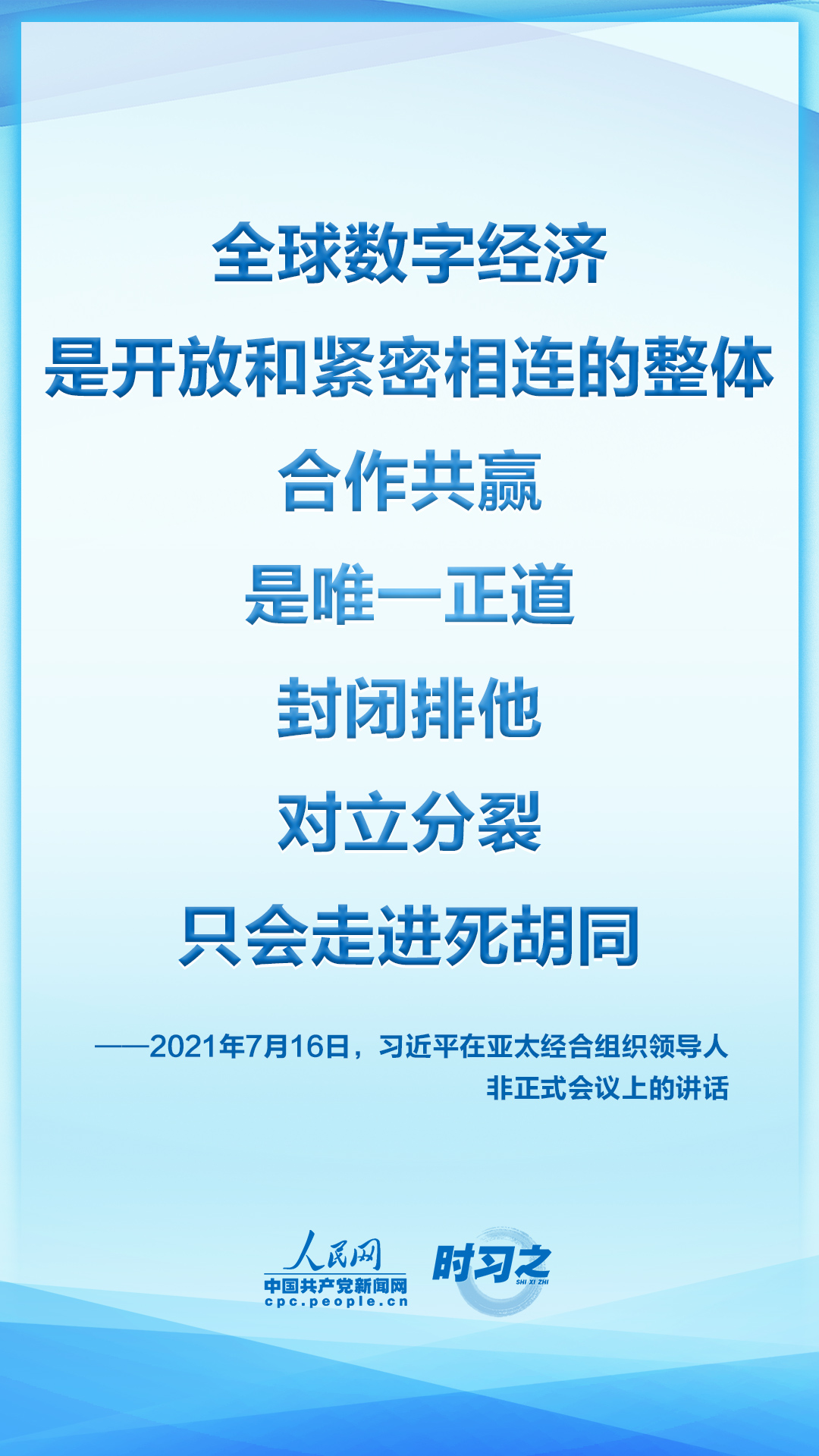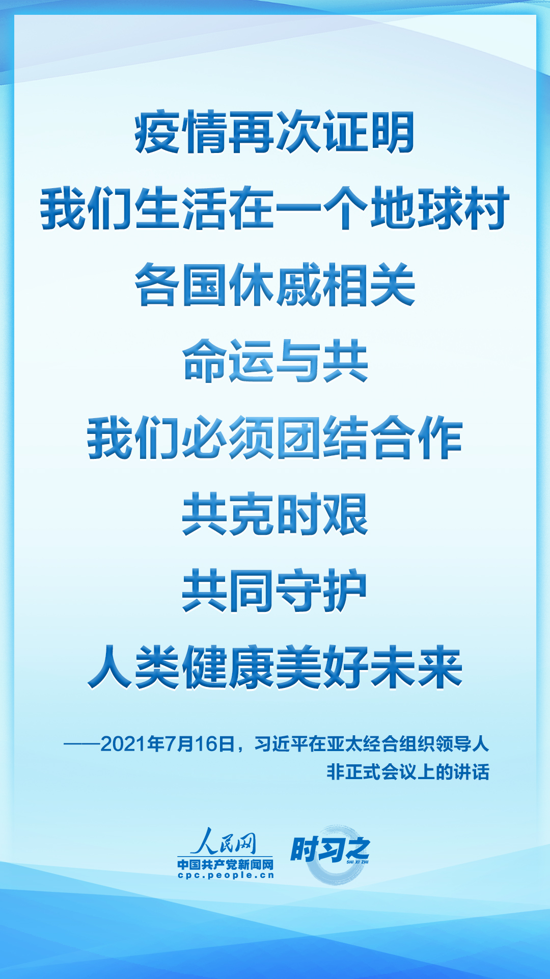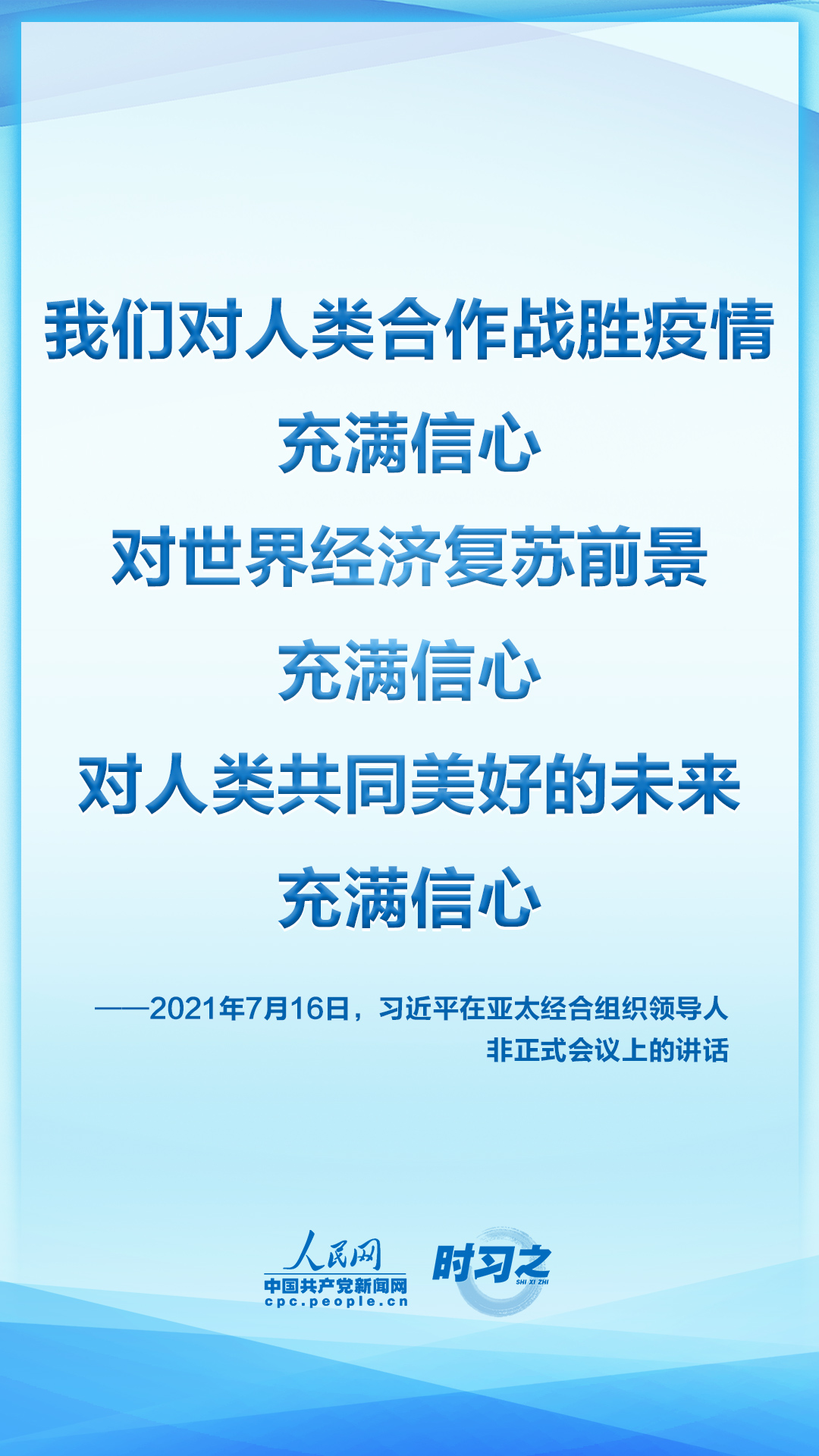 7月16日晚,国家主席习近平应邀在北京以视频方式出席亚太经合组织领导人非正式会议并发表讲话。他指出,当前,新冠肺炎疫情起伏反复,疫情防控形势依然严峻。同时,和平与发展仍然是时代主题,维护多边主义,加强团结合作,共同应对挑战的呼声更加强烈。我们去年通过了亚太经合组织2040年愿景,提出了亚太共同体目标。亚太是世界经济增长的重要引擎。早日战胜疫情,恢复经济增长,推动世界经济复苏,是亚太各成员当前最重要的任务。