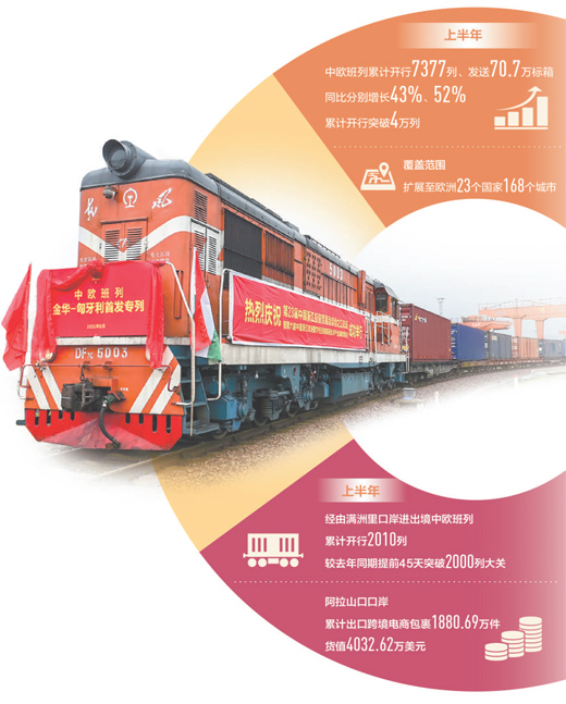 一个个不断攀升的指标,反映出中欧班列的快速发展。中国国家铁路集团有限公司的数据显示,今年上半年,中欧班列累计开行7377列、发送70.7万标箱,同比分别增长43%、52%,再创新高。